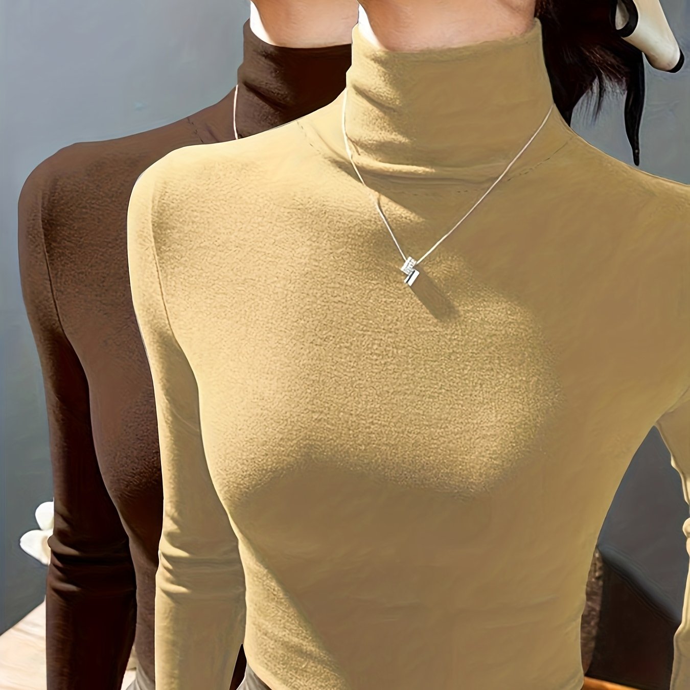 TEMU 새로운 가을/겨울용 플러시 안감의 슬림핏이면서도 우아한 여성용 하이넥 긴팔 티셔츠