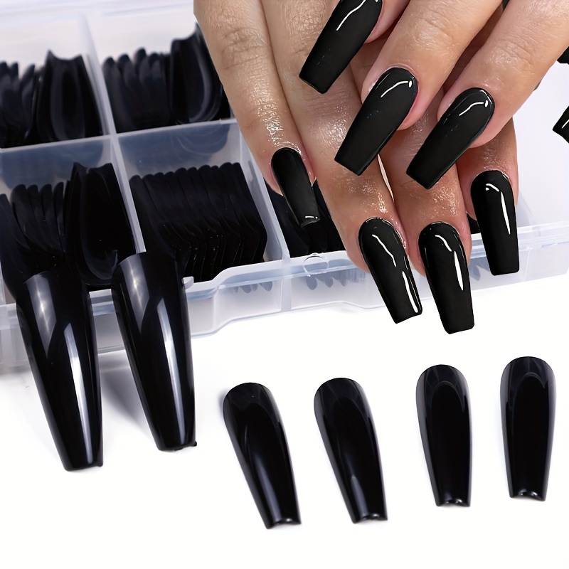 TEMU 120개 블랙 프레스온 네일 - 풀 커버리지, 발레트 쉐입, 중간 길이, 솔리드 컬러, 광택 마감 - 매니큐어 및 연장용 내구성 아크릴 네일, 12가지 사이즈 제공