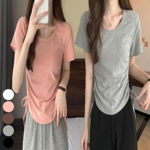 [셀러허브_여성트랜드패션]여자 옆 U넥 라운드넥 슬림핏 셔링 티셔츠 반팔