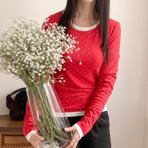 [다잇템][다잇템] 여자 편한 슬림핏 롱슬리브 빨간티 땡땡이 U넥 티셔츠_24129389_588872