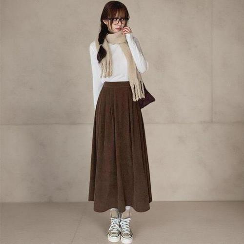 [옷자락]여성 스웨이드 플레어 롱 스커트 뒷밴딩