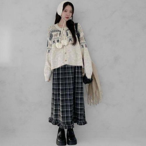 [옷자락]여성 체크 무늬 프릴 헴 플레어 롱 스커트